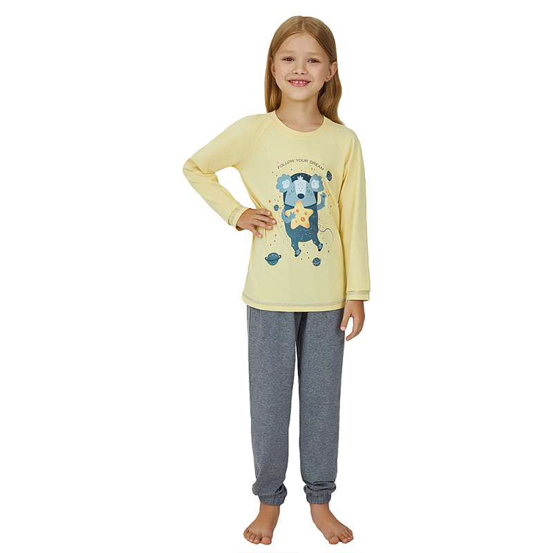 Домашняя пижама для девочки из хлопка с добавлением эластана. Комплект состоит из футболки с длинным рукавом и штанов. Футболка имеет яркий принт с надписью: "Следуй за своей мечтой"
