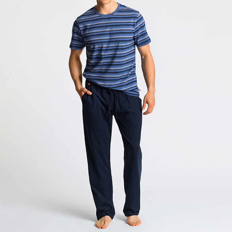 Мужская пижама состоящая из принтованной футболки с коротким рукавом и однотонных брюк. Объем талии регулируется завязками, в поясе брюк присутствует мягкая резинка. Материал изготовления - высококачественный мягкий хлопок, приятный на ощупь и позволяющий коже дышать.