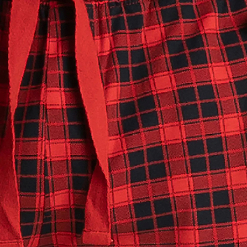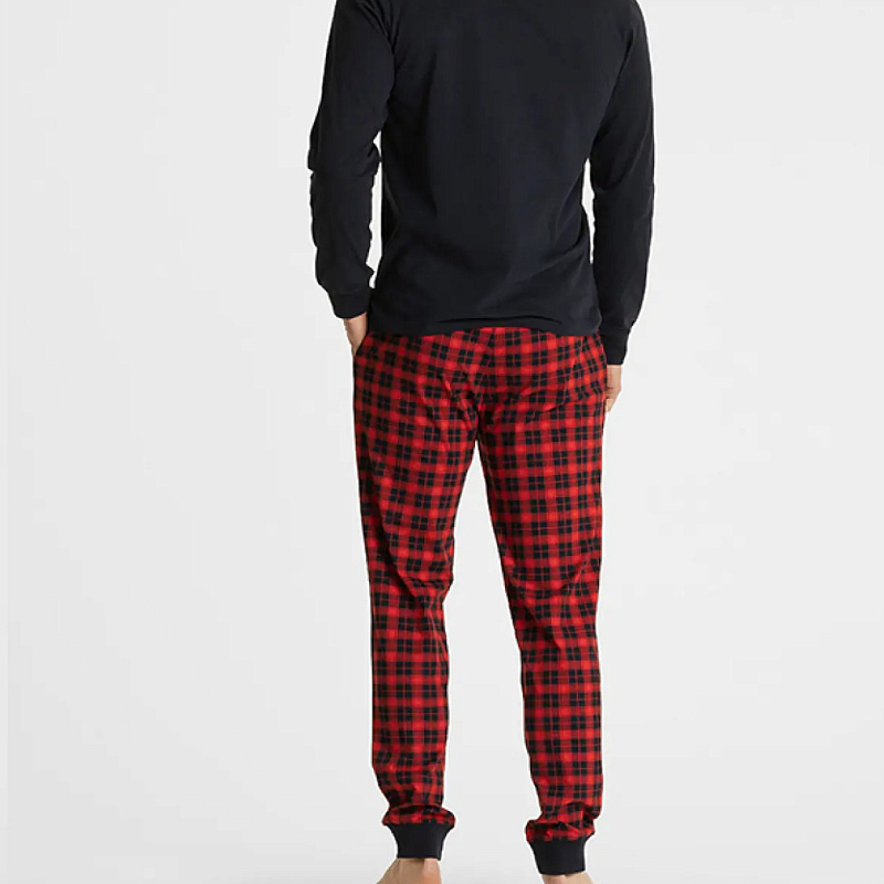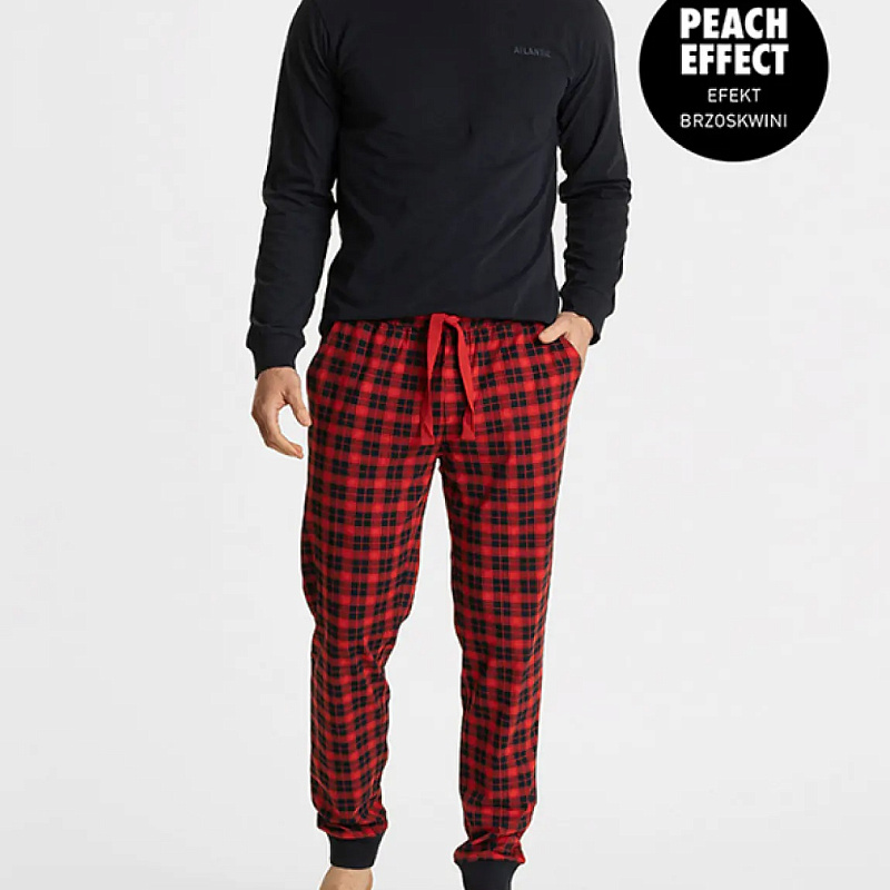 Чоловіча піжама складається з темно-синього однотонної кофти з довгим рукавом та червоних брюк в клітинку. Футболка має злегка облягаючий крій, круглу горловину, манжети на рукавах і невеликий логотип Atlantic зліва. Штани вільного крою мають кишені з боків, тасьму в талії та штанини із зручними манжетами. Піжама виготовлена з приємної на дотик бавовни, яка додатково оброблена процедурою - так званою «персиковий ефект», що означає, що тканина вкрита дрібним пухнастим ворсом, який тактильно нагадую оксамитову шкіру персика.