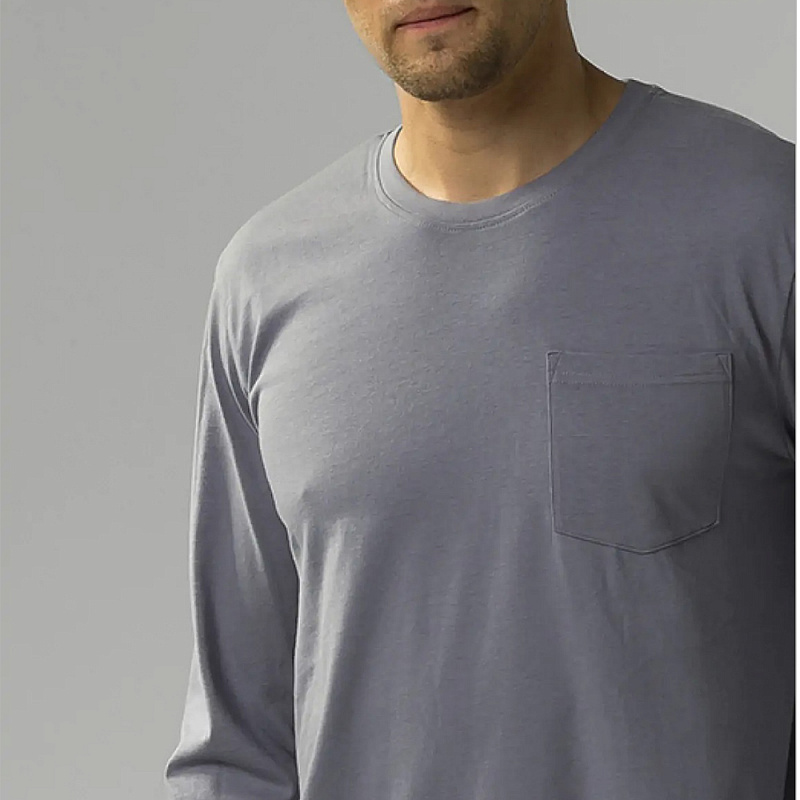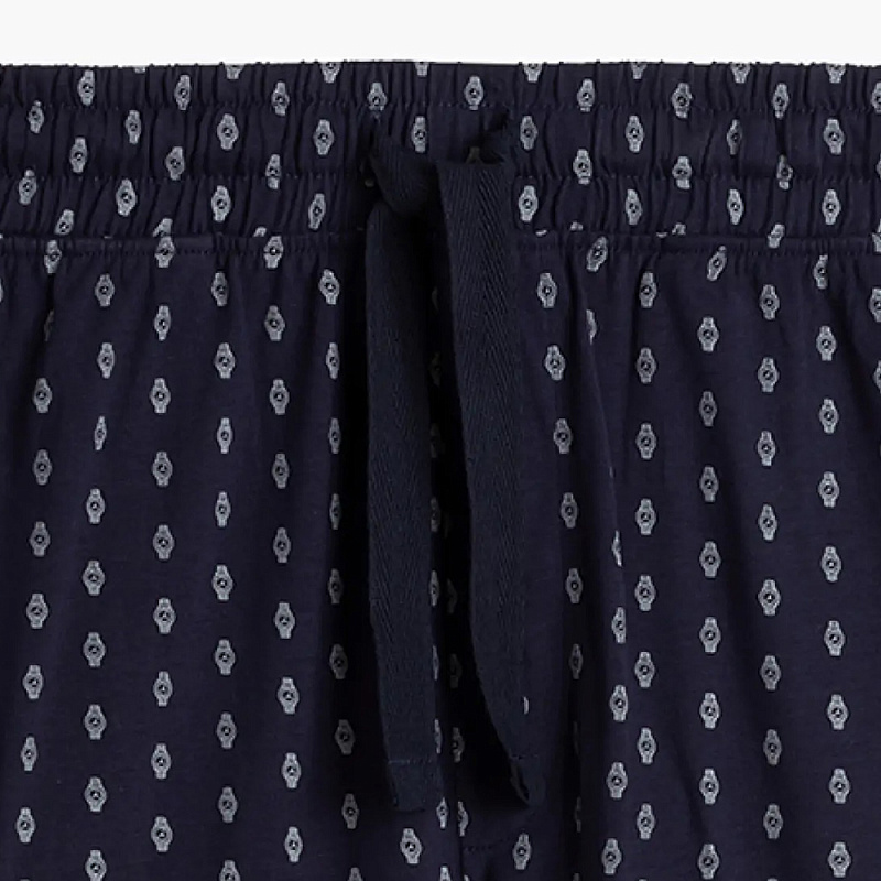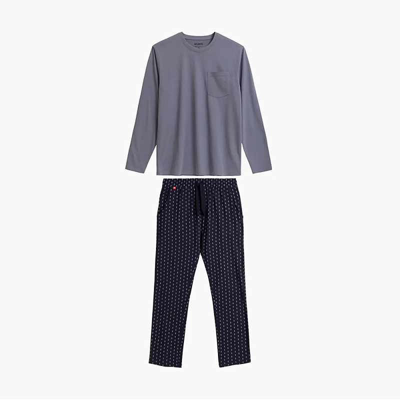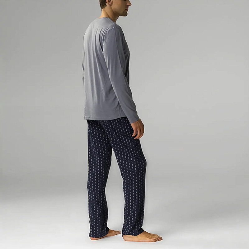 Мужская пижама состоит из однотонной серой футболки с длинными рукавами и длинных темно-синих штанов с небольшим принтом в виде часов. Футболка прямого кроя, с круглой горловиной и карманом на груди, а свободные брюки без манжетов, с боковыми карманами и шнурком для регулировки в талии.