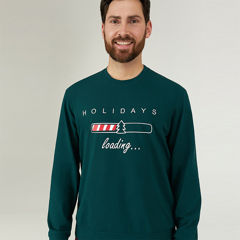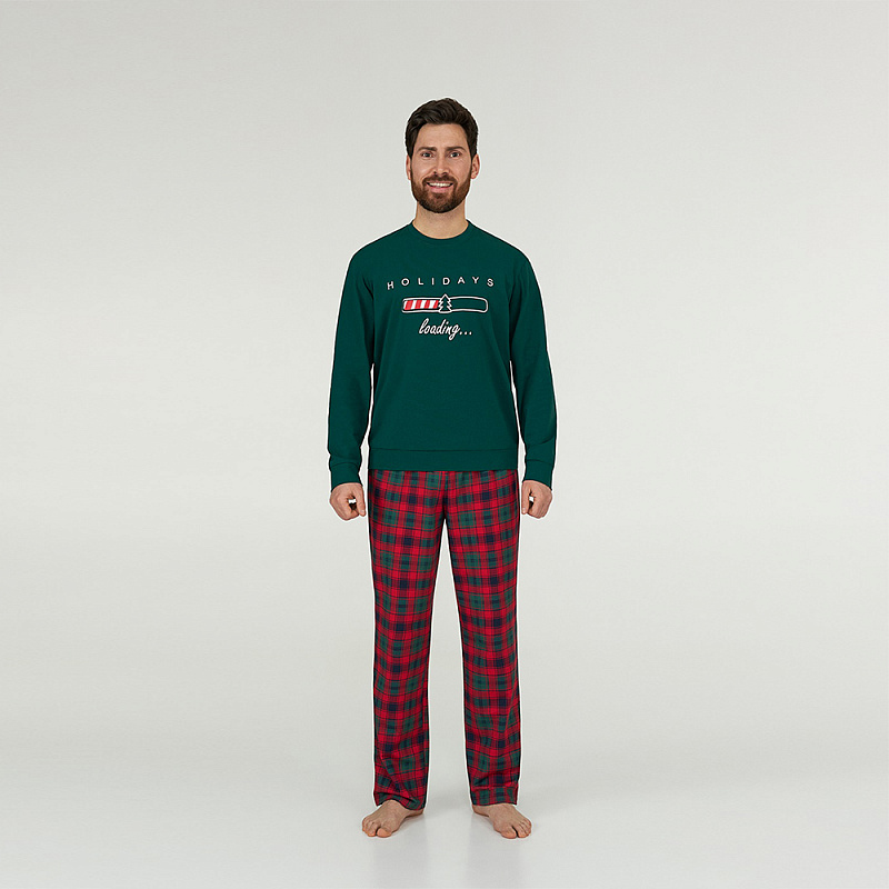 Домашняя мужская пижама из хлопка с добавлением эластана. Комплект состоит из футболки с длинным рукавом и брюк. Футболка принтованная, брюки в клетку. Утепленная флисом.