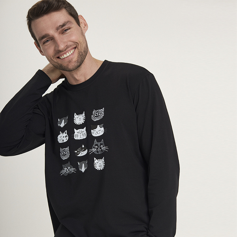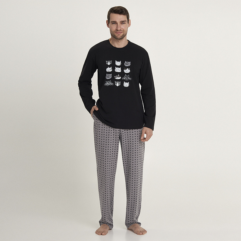 Комплект виконаний з якісної та м'якої бавовни, складається з кофти чорного кольору та сірих штанів з графічним принтом чорного кольору. Кофта з довгими рукавами та круглим вирізом горла, спереду прикрашена принтом із кумедних тварин. Штани прямого крою, з м'якою гумкою в поясі та зручними бічними кишенями.