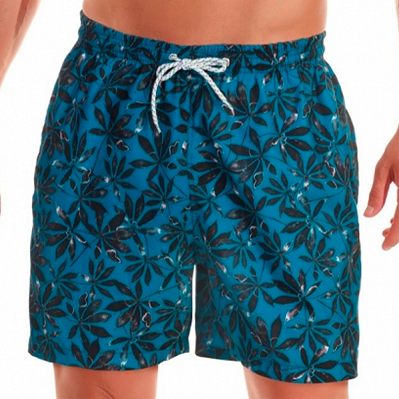 Мужские пляжные шорты из 100%-го полиэстра. Данная модель имеет удобные боковые карманы, есть шнуровка. Яркий принт.