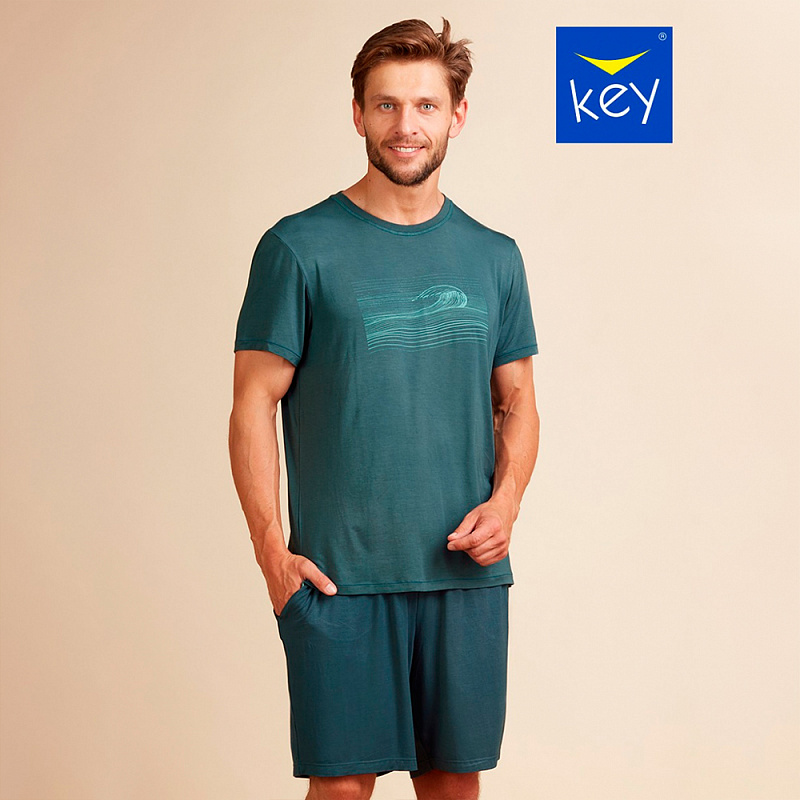 Стильная мужская пижама от польского бренда Key. Пижама выполнена из качественного бамбука с добавлением эластана, состоит из футболки и шорт. Футболка свободного кроя, с короткими рукавами, круглым вырезом горловины. Шорты прямые с мягкой резинкой в поясе и удобными боковыми карманами, регулируются по ширине шнурком.