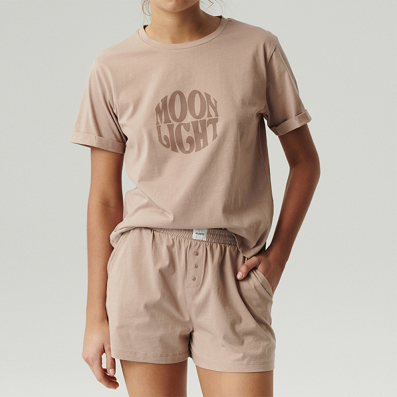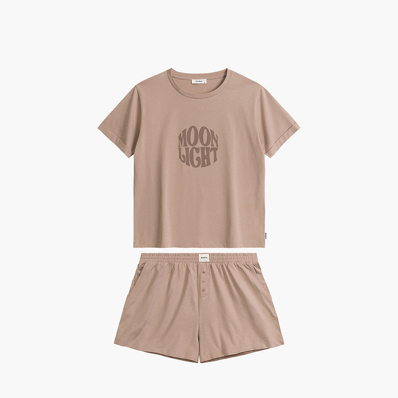Піжама складається з футболки з коротким рукавом з відворотом, акуратною круглою горловиною і крупним написом Moon Light та шортів з кишенями з боків та м’яким, еластичним поясом з делікатним логотипом Atlantic.