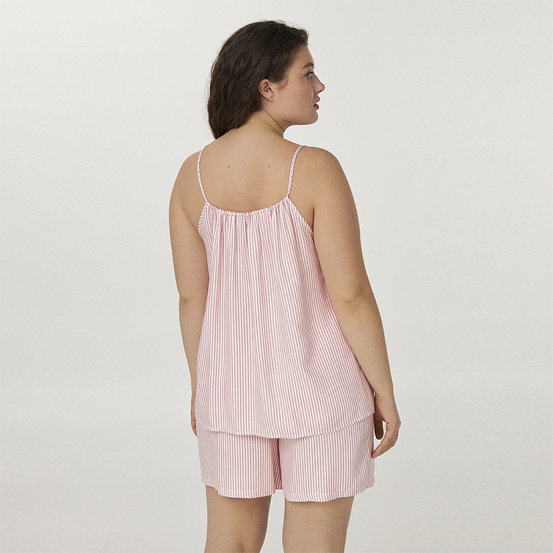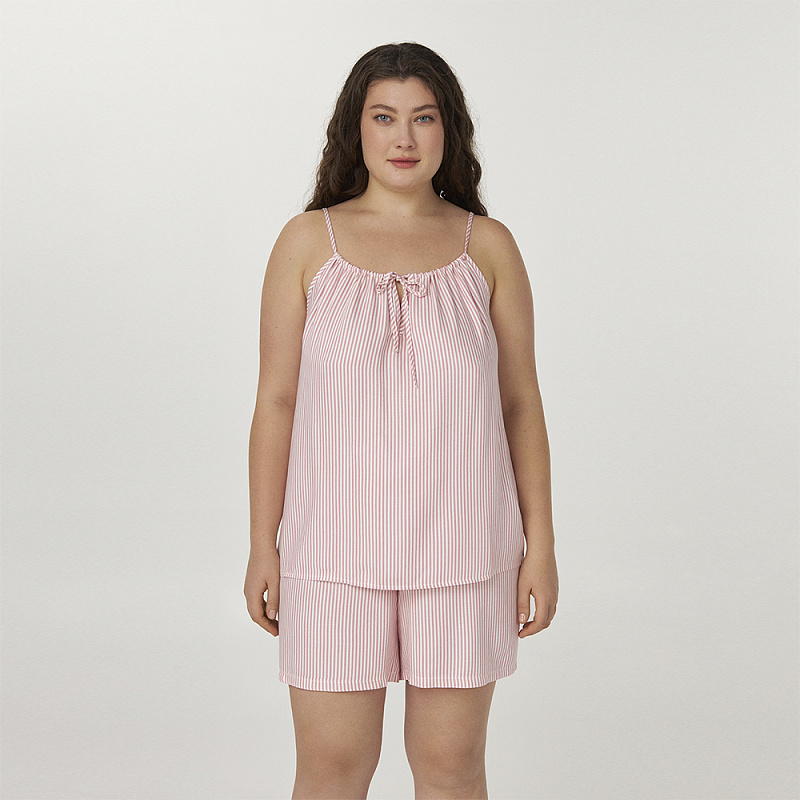 Піжама виконана з якісної та м'якої віскози, рожевого кольору в білий смугастий принт, складається з майки вільного силуету та коротких шортів. Майка на тонких бретелях та з круглим декольте, шорти прямого крою та з м'якою гумкою у поясі. Спинка та передня полиця майки оброблені м'якими складками за рахунок бретель, які регулюються по довжині та зав'язуються на грудях.