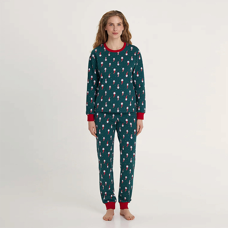 Яркая женская новогодняя пижама от украинского бренда Ellen. Выполнена из мягкого, качественного хлопка с начёсом. Пижама зелёного цвета с новогодним принтом, состоит из кофты и брюк. Кофта прямого кроя, с длинными рукавами и круглым вырезом горловины, манжеты и ворот обработаны красной отделкой. Брюки с мягкой резинкой на поясе и трикотажными красными манжетами внизу. Пижама очень тёплая, приятная к телу и удобная для сна.