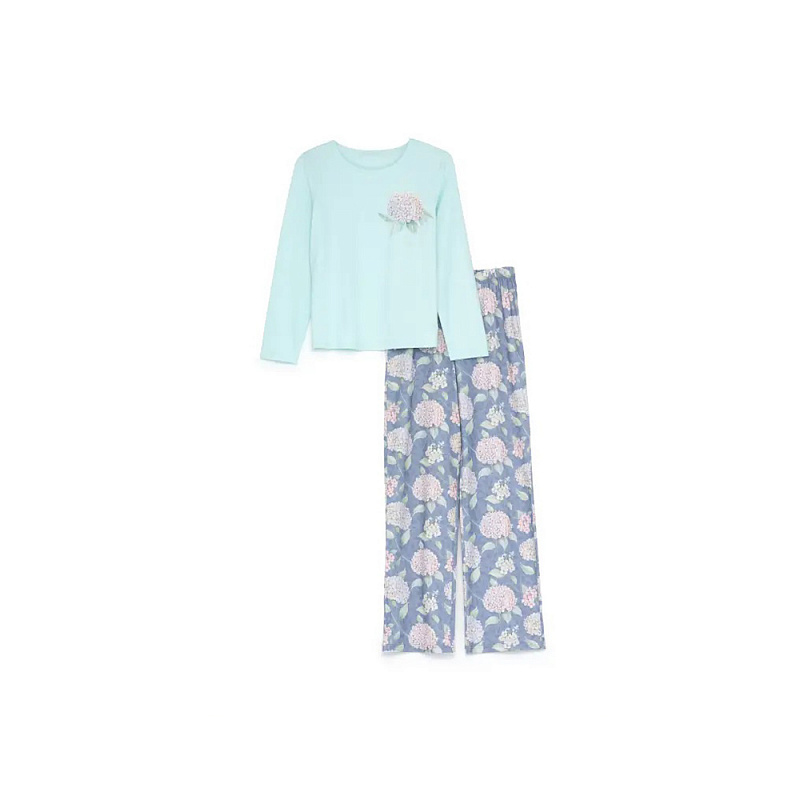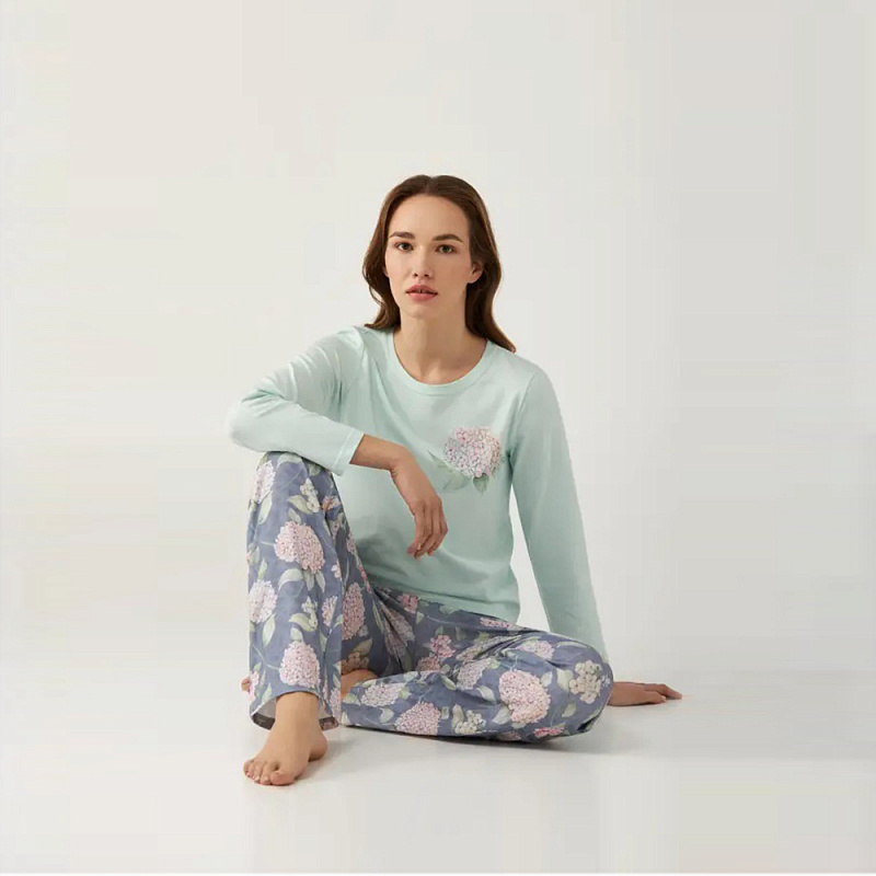 Женский комплект выполнен из мягкого хлопка. Футболка с длинным рукавом. Брюки цветные, мягкая и эластичная резинка в поясе.