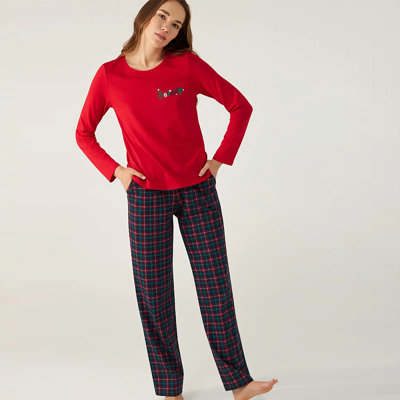 Комплект складається зі штанів та кофти, виготовлений з бавовни та додаванням еластичних волокон. Кофта має круглу горловину, вільний довгий рукави. Пояс штанів на резинці, є кишені з обох боків.