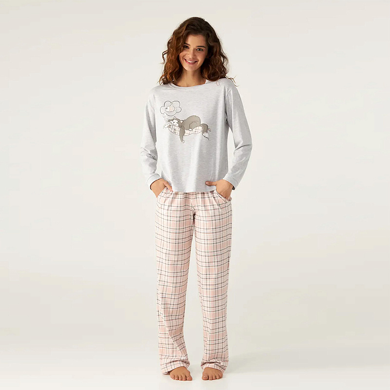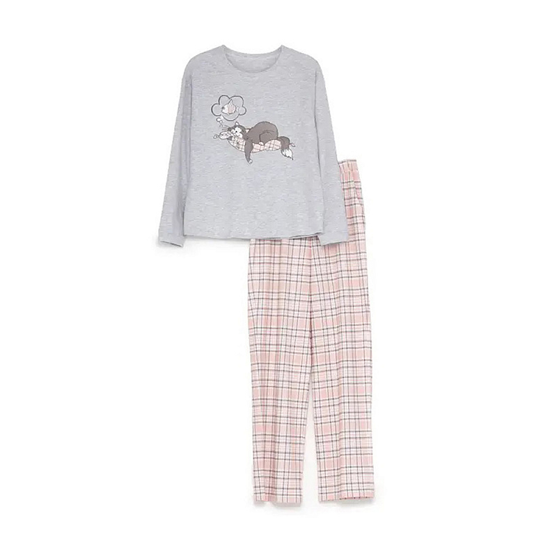 Пижама выполнена из качественного и мягкого хлопка, состоит из кофты серого цвета и розовых штанов с клетчатым принтом. Кофта свободного силуэта, с длинными рукавами и круглым вырезом горла, горловина и рукава обработаны манжетами.