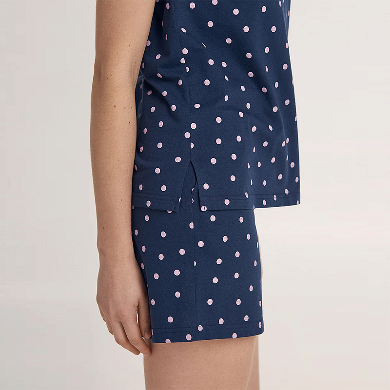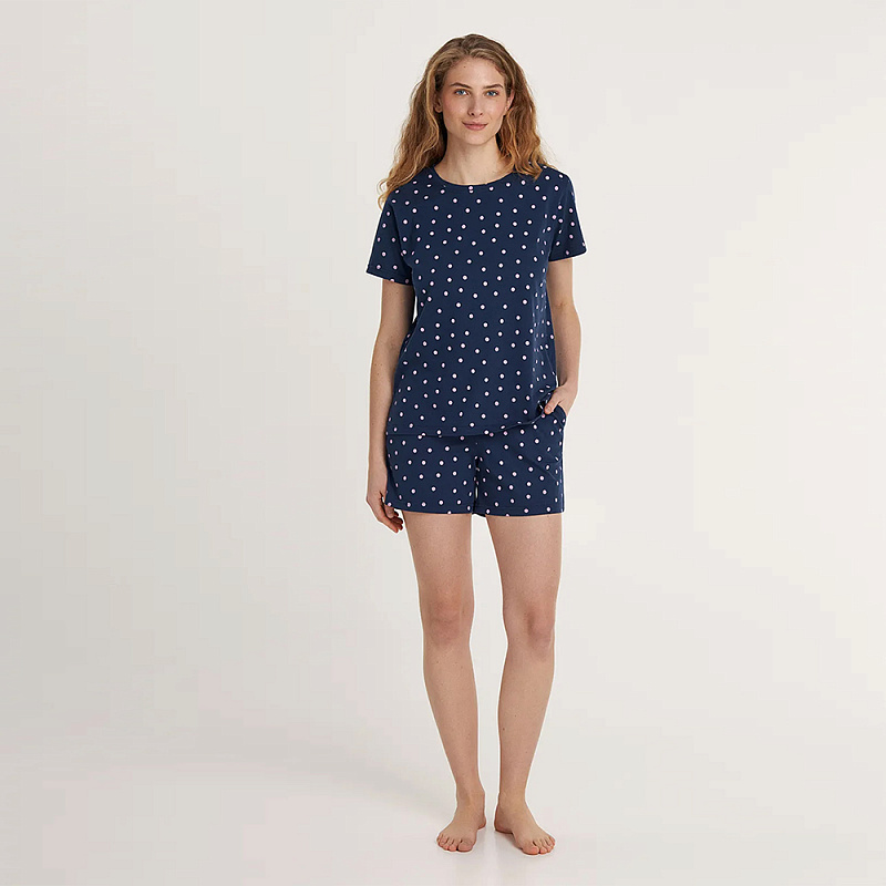 Женский домашний комплект выполнен из мягкого хлопка. В комплект входят футболка с коротким рукавом и шорты.