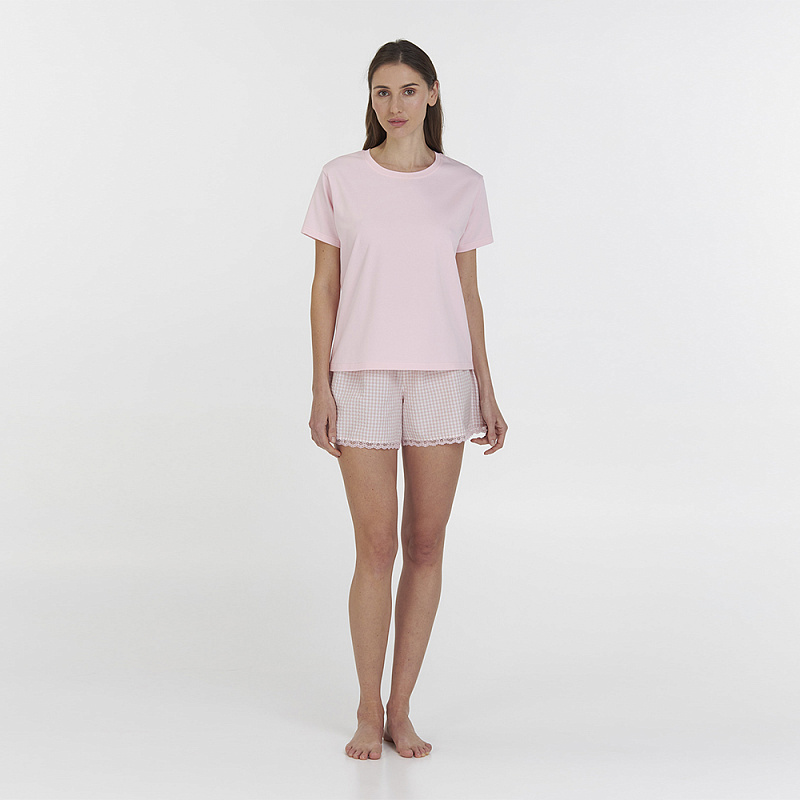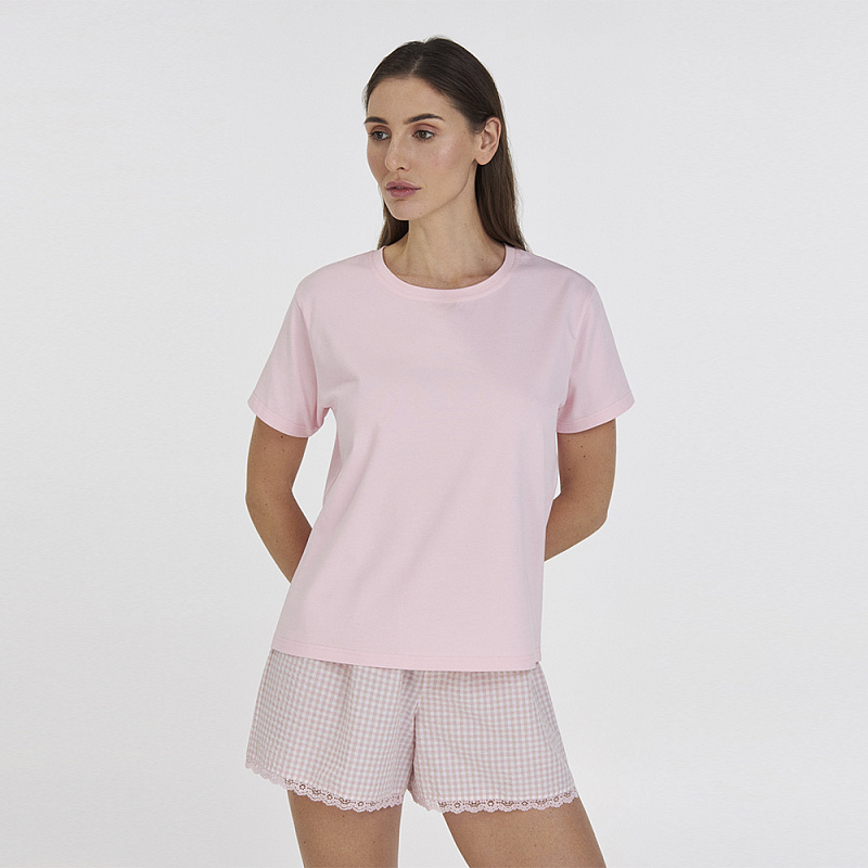 Жіночий комплект для дому виконаний з м'якої бавовни. Комплект складається з футболки з коротким рукавом та шортом.