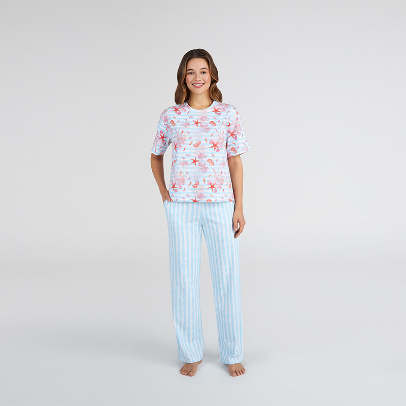 Пижама выполнена из качественного и мягкого хлопка голубого цвета в белую полоску, состоит из штанов и футболки в красный принт морских животных. Футболка свободного кроя, с короткими рукавами и круглым вырезом горла, штаны с мягкой резинкой в поясе и удобными боковыми карманами.