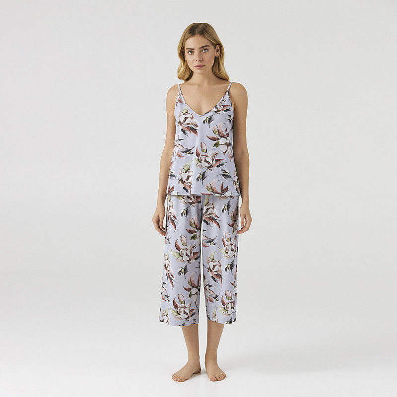 Пижама выполнена из качественного и мягкого хлопка. Состоит из майки свободного кроя и капри. Майка на тонких бретелях и с V-образным вырезом горла, капри с мягкой резинкой в поясе.