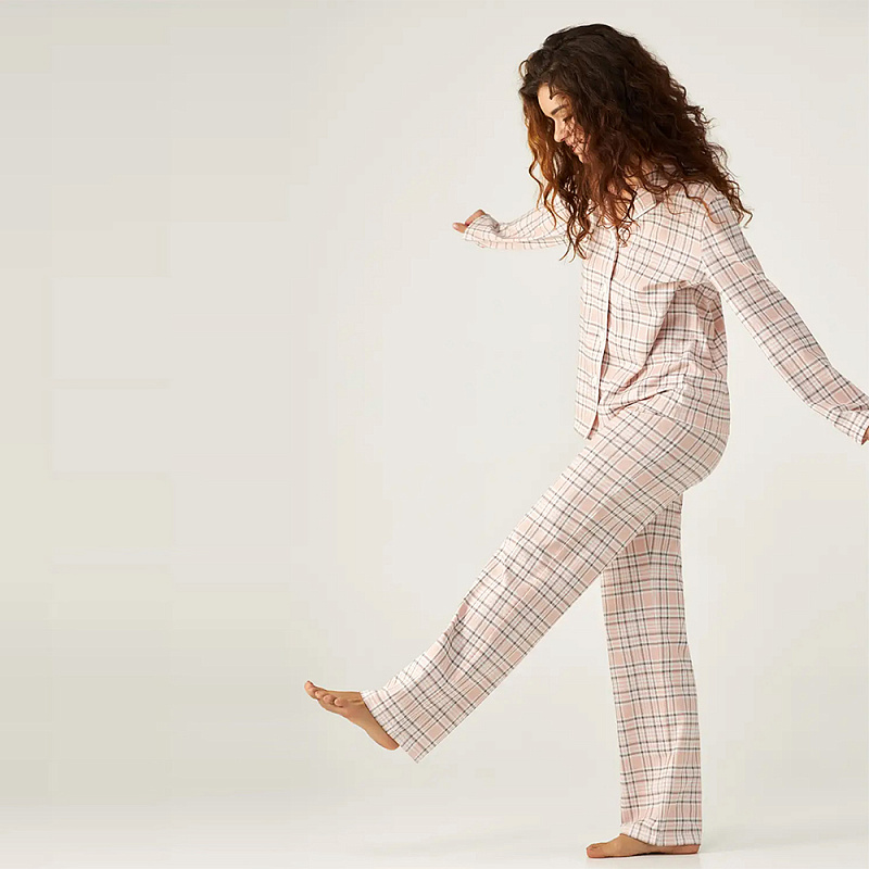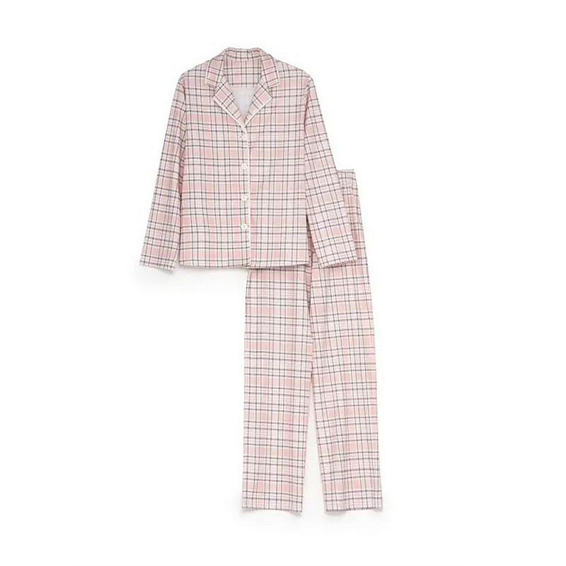 Пижама выполнена из качественного и мягкого хлопка, розового цвета в серый клетчатый принт, состоит из рубашки и штанов. Рубашка свободного силуэта, с длинными рукавами и отложным воротником, застегивается на пуговицы. Воротник и полки модели украшены тонким кантом белого цвета, штаны прямого кроя, с мягкой резинкой в поясе.