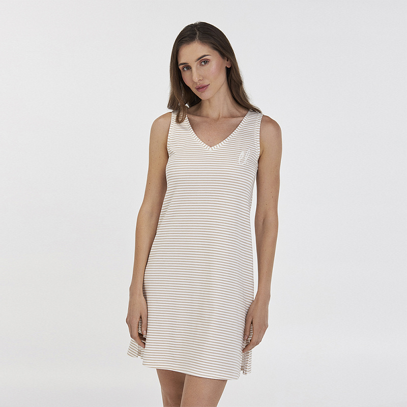 Ночнушка выполнена из качественного и мягкого хлопка, бежевого цвета в тонкую белую полоску, без рукавов и длиной выше колен. Модель прямого силуэта, с V-образным вырезом горла и небольшими боковыми разрезами внизу, на груди слева украшена вышивкой из названия бренда.