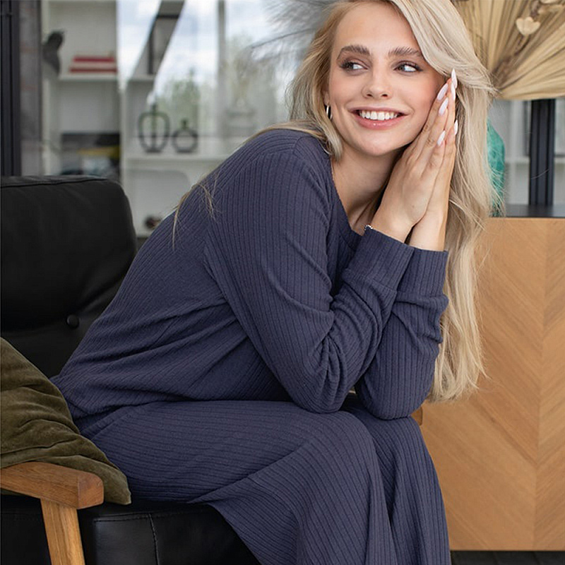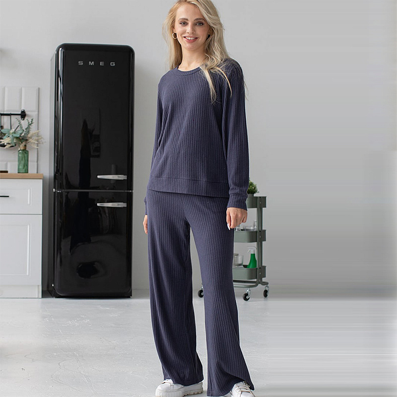 Комплект для дома и отдыха выполнен из мягкой и приятной ткани "вискоза". Кофта с длинными рукавами на манжетах, круглый вырез горловины. Брюки удерживаются на талии вшитой резинкой, есть два боковых кармана.